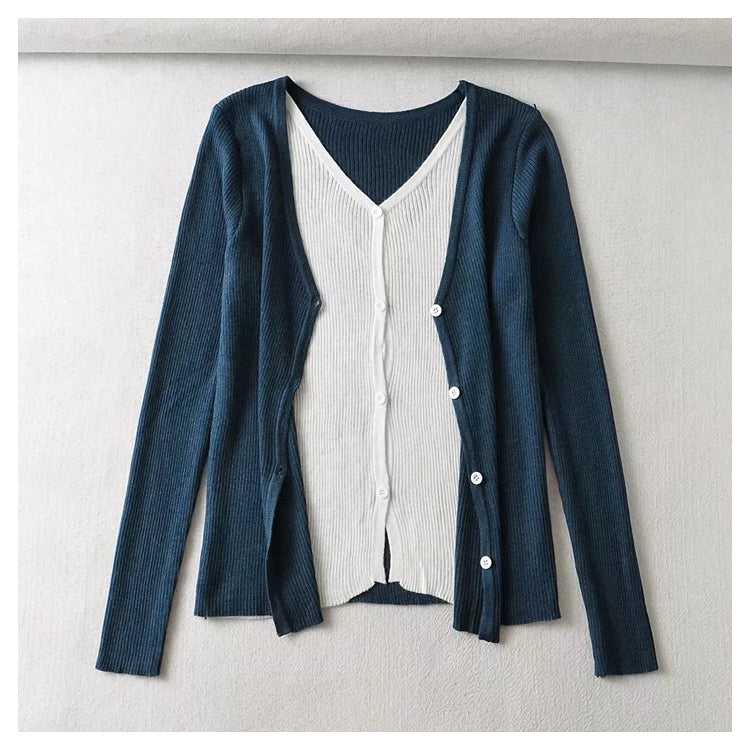 V-neck breasted color contrast fake two slim knit Cardigans 7471