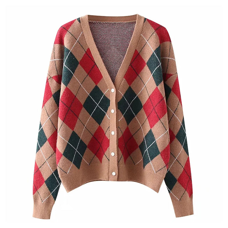 V-neck diamond check button long sleeve loose knit cardigan coat 7362