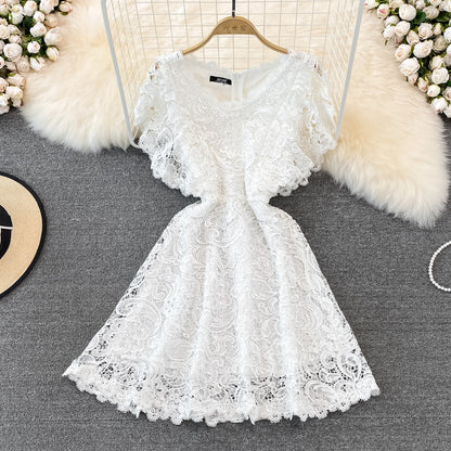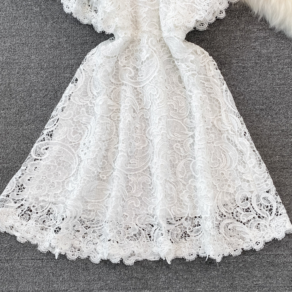 V-neck waistband shows thin, flying sleeve A-line lace dress 11200